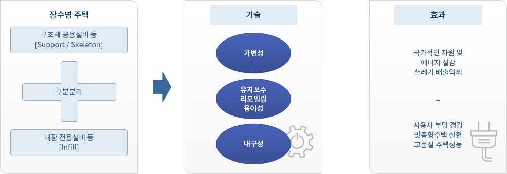 수명이 길고 사회적 변화와 영향이 적은 구조체 및 공용설비인 서포트 부분을 유지하고, 수명이 짧으면서 사회적 기능적인 변화에 민감한 외장, 내장, 설비 등 인필부분을 쉽게 변화·교체함으로써 사회 및 거주자의 요구 변화에 맞게 기능과 성능을 수용할 수 있는 주택